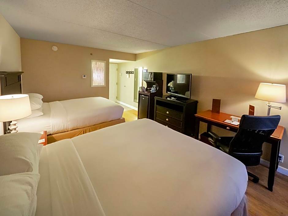 This room has 1 bedroom with 2 queen beds and a living room and a bathroom.